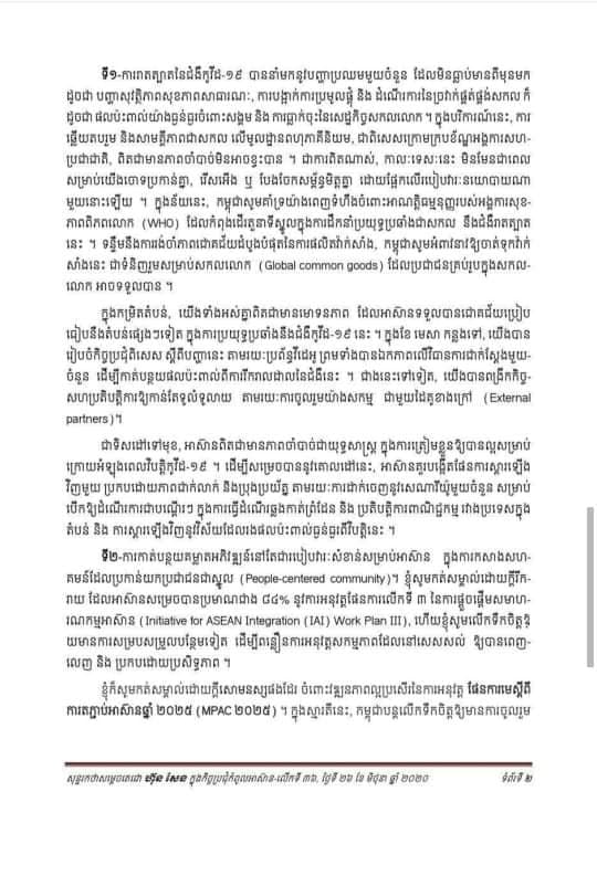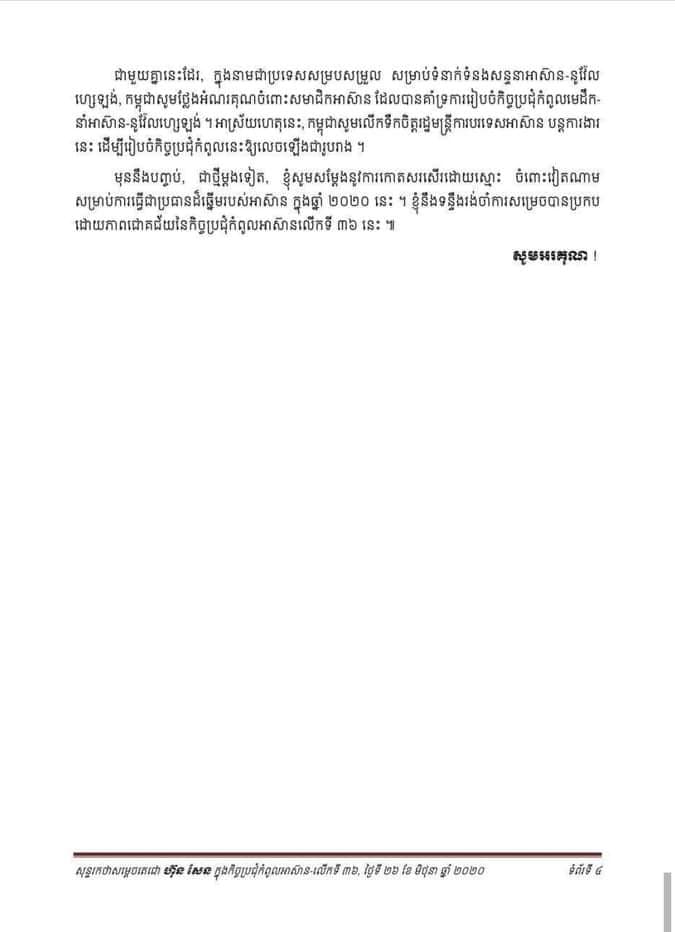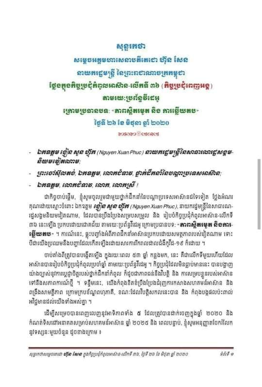 26 June, 2020 Share this post Share on FacebookShare on Facebook TweetShare on Twitter Related postsសម្តេចតេជោ ៖ បានផ្ញើសារបំភ្លឺទៅកាន់ប្រជាជនកម្ពុជា និងប្រជាជនថៃពីរឿងស៊ីហ្គេមលើកទី៣២ ឆ្នាំ២០២៣ នៅកម្ពុជា6 December, 2025សុន្ទរកថានិងសេចក្ដីអធិប្បាយ សម្ដេចមហាសេនាបតីតេជោ ហ៊ុន សែន ពិធីបើក «អនុសំវច្ឆរមហាសនិ្ន បាតមន្រ្ដីសង្ឃទូទាំងប្រទេស លើកទី៣៣»17 November, 2025ការដកស្រង់សេចក្តីអធិប្បាយ សម្តេចតេជោ ហ៊ុន សែន ក្នុងសម័យប្រជុំលើកទី៤ ព្រឹទ្ធសភា នីតិកាលទី៥24 October, 2025